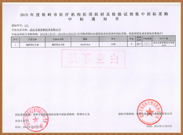 【遼寧省2015年度鐵嶺市醫(yī)療機(jī)構(gòu)醫(yī)用耗材及檢驗試劑集中招標(biāo)采購中標(biāo)通知書】我們東科圣康品牌的胸腔固定夾板術(shù)前術(shù)后外固定耗材在2015年度鐵嶺市醫(yī)療機(jī)構(gòu)集中采購中已成功中標(biāo),中標(biāo)價格較為優(yōu)惠產(chǎn)品醫(yī)生操作起來比較簡單,而且可以提升接診率,產(chǎn)品輕便舒適等特點(diǎn)。
