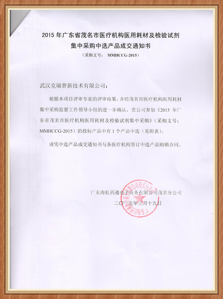 (廣東省茂名市醫(yī)用耗材集中采購(gòu)中選產(chǎn)品通知書)